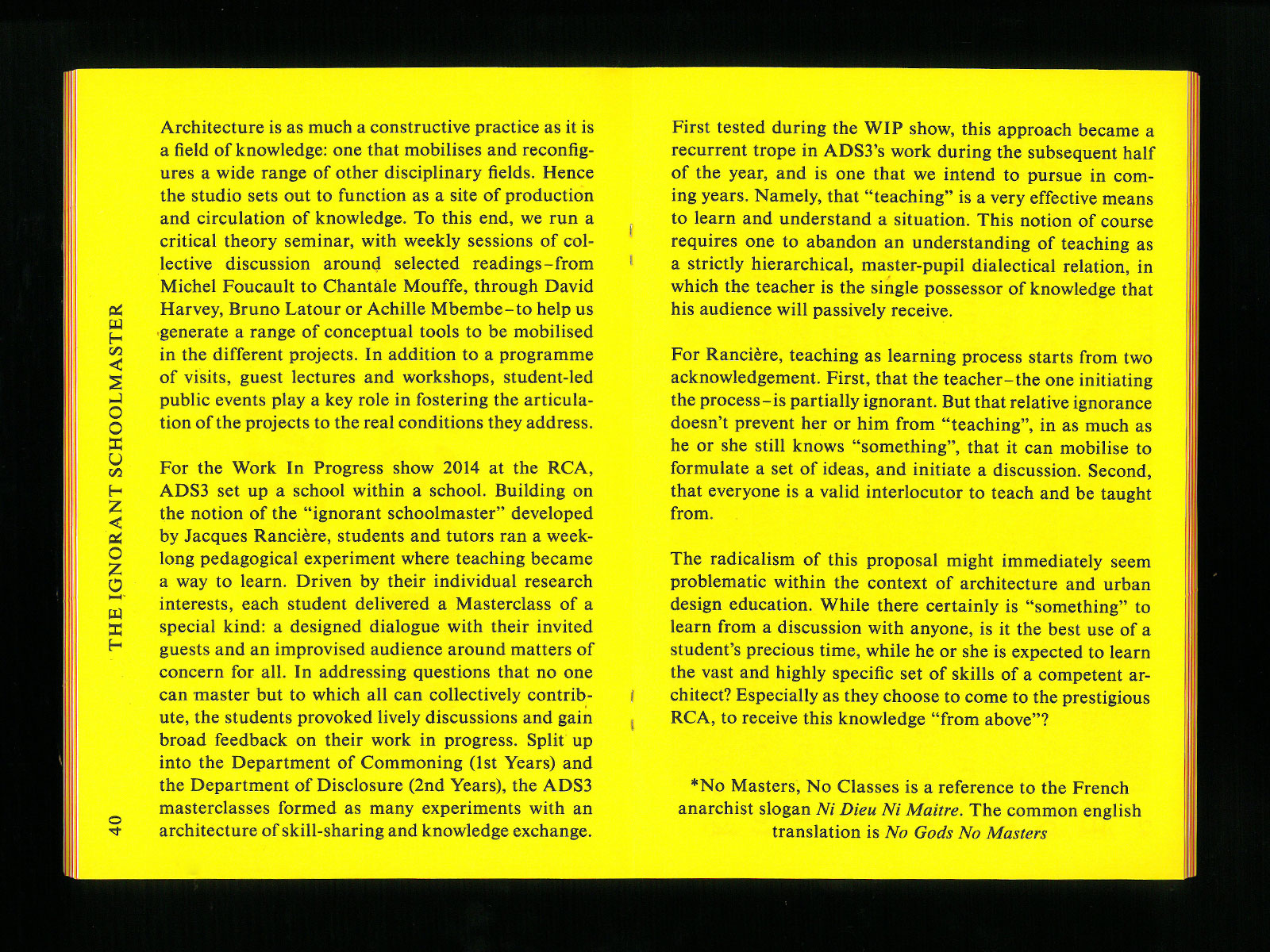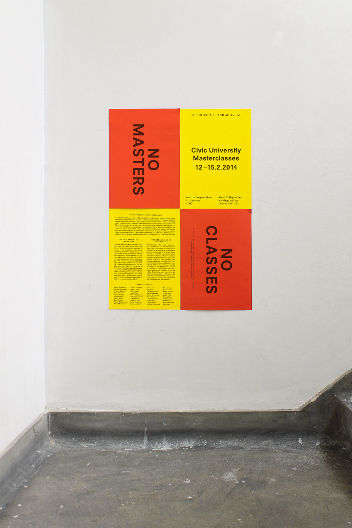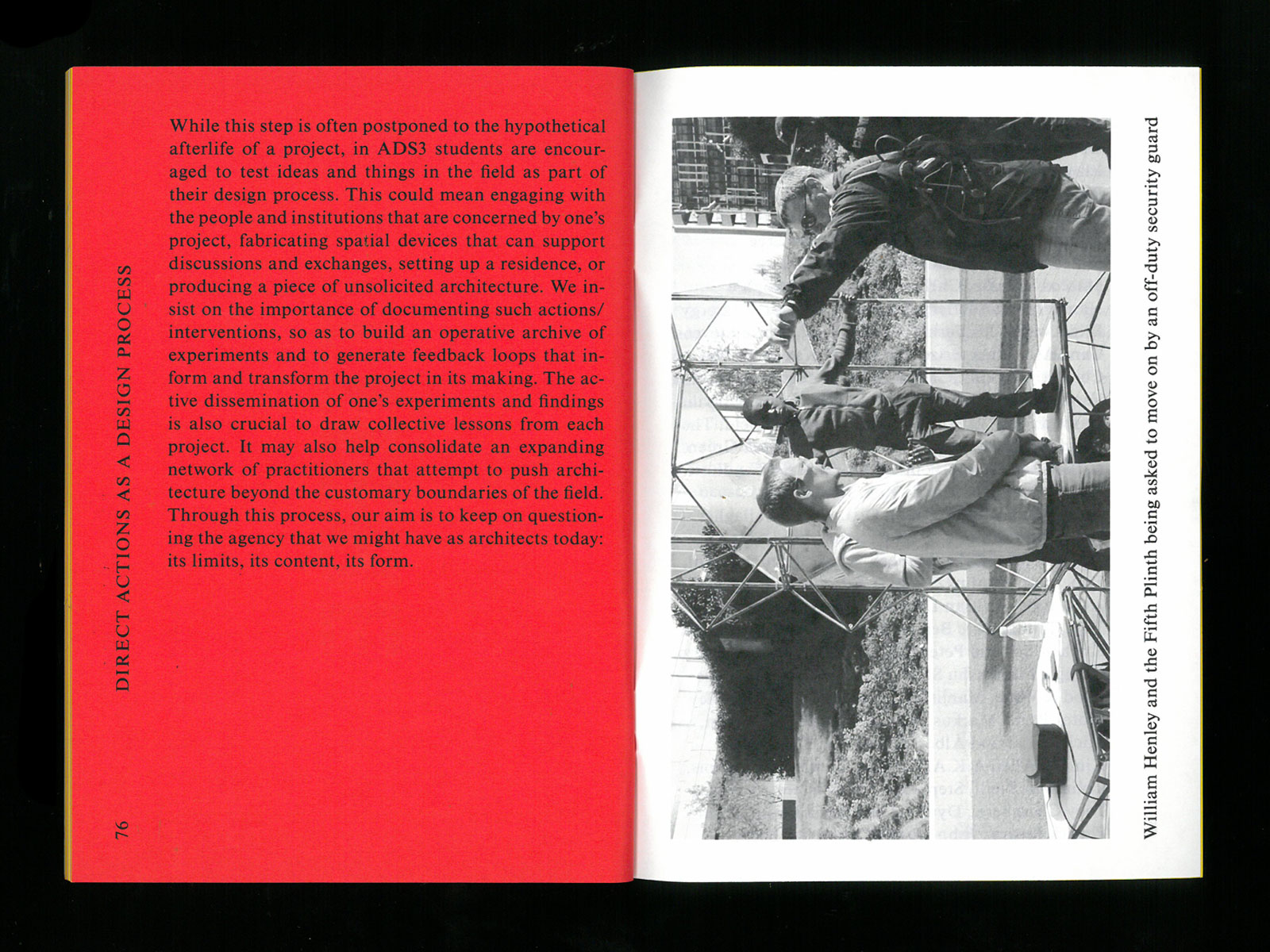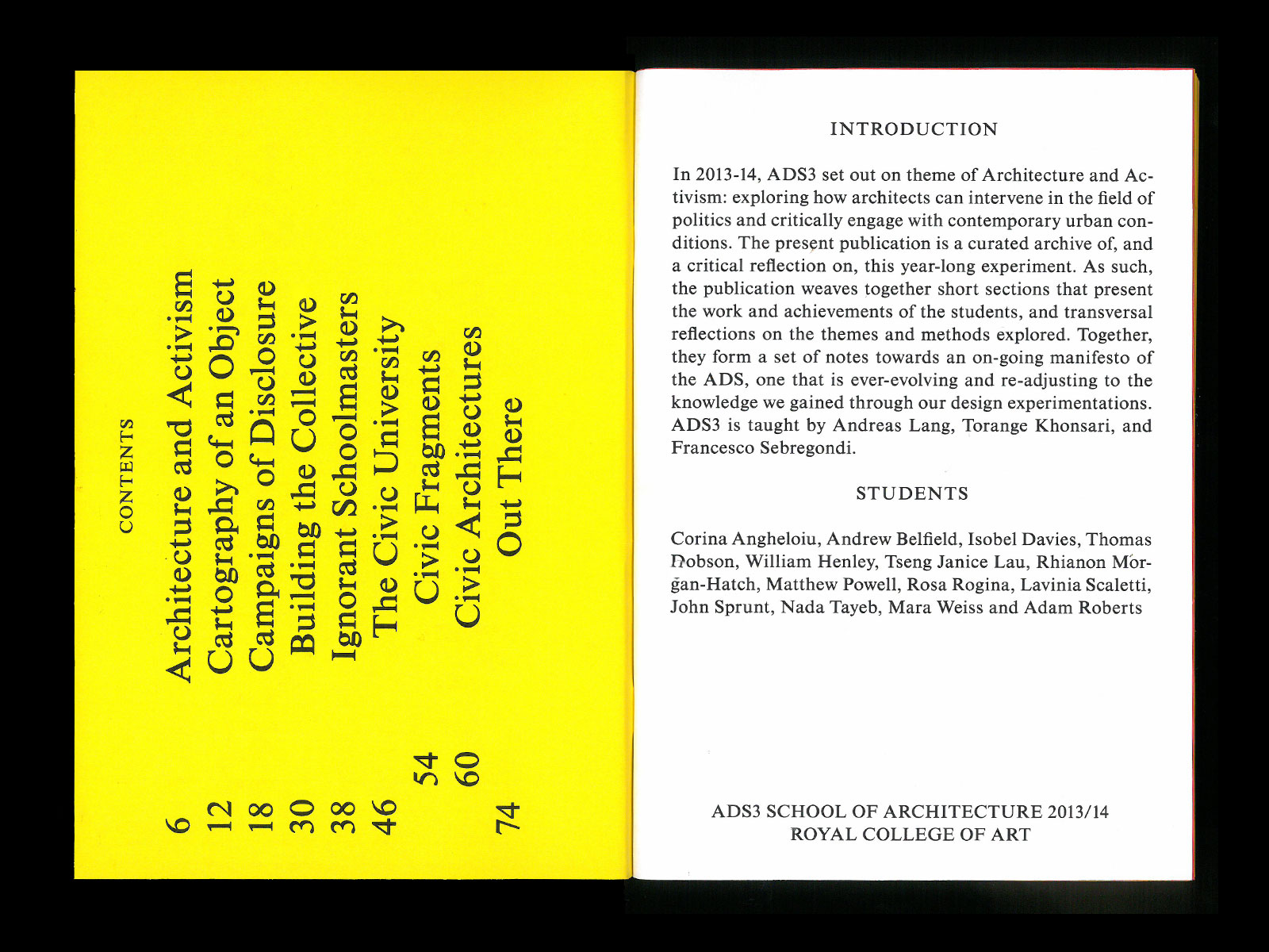 Architecture and Activism is the title of one of the architecture programs at Royal College of Art. The course investigates two alternative themes: Activism as architecture – how to mobilise architectural theory and practice in the field of activism? How can an activist campaign be thought of as an architectural project, as fabric of relations between places, agencies, and institutions? Architecture as activism – What is the potential agency of architects in the field of politics? Can architecture formulate its own claims, demands, agenda, and above all, its own questions?