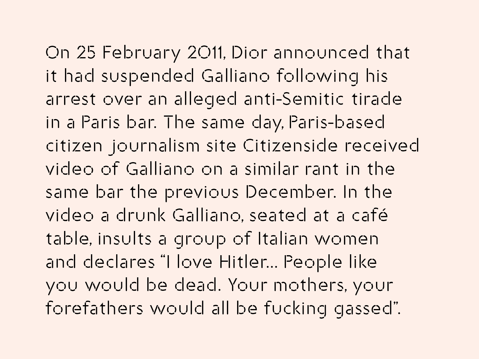 This custom typeface was first used in a catalogue and exhibition display for the final year show of BA womenswear at Central Saint Martins. The design draws inspiration from examples of mid 20th century stencilled type found on tailor dummies within the studio space. This typeface was designed in collaboration with Diego Ulrich.