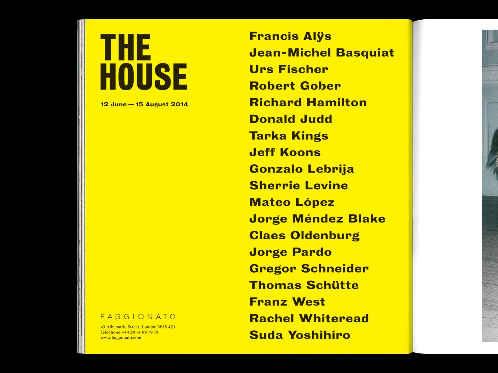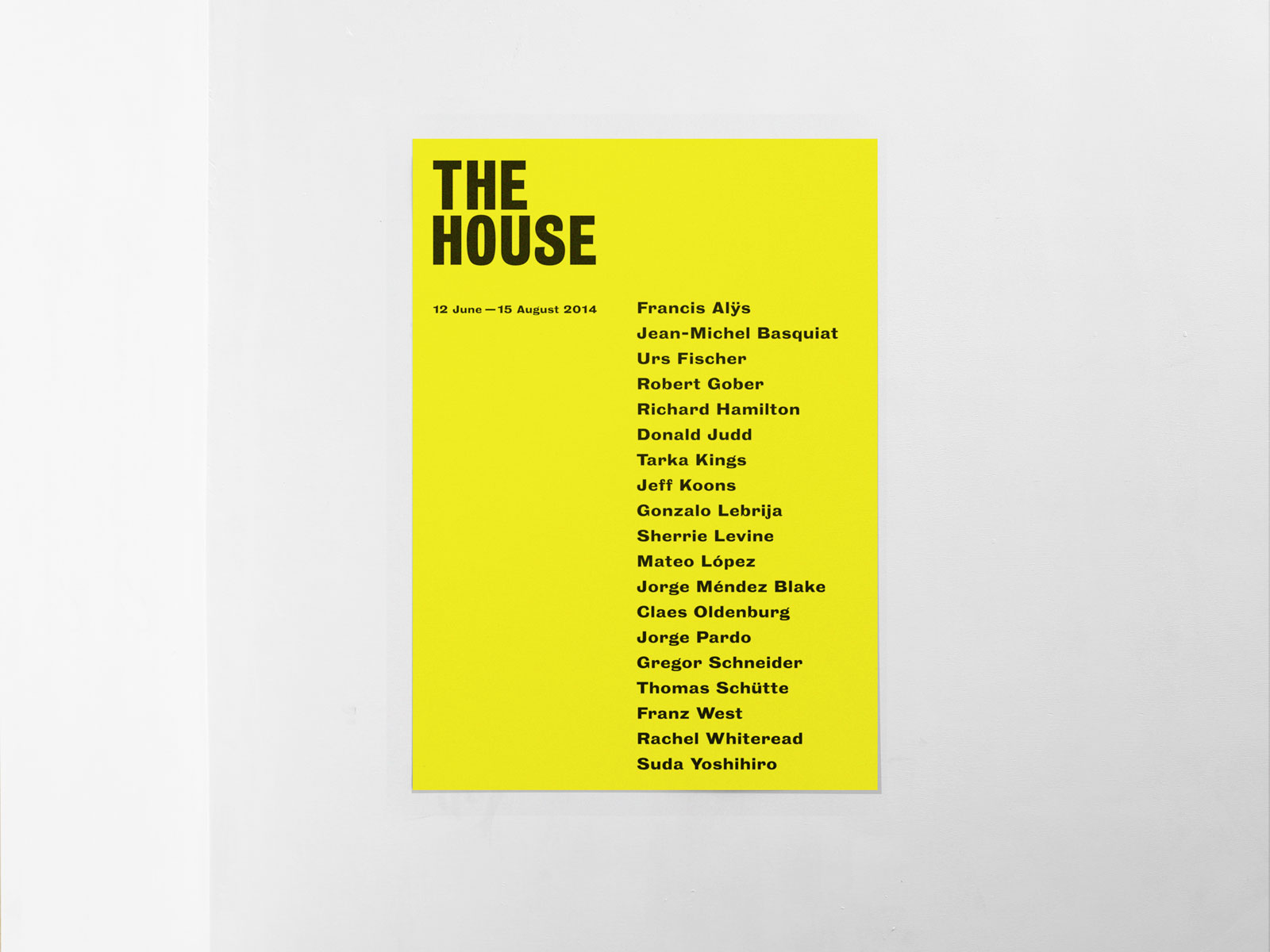 Broadly inspired by Claes Oldenburg’s critical 1964 exhibition "The Home", Faggionato’s "The House" brought together notables of the 20th and 21st Centuries. Works by artists such as Donald Judd, Richard Hamilton and Francis Alÿs, were arranged to form a seemingly domestic environment. The exhibition serves as an enquiry into the vague territory linking abstraction to representation, from art object to reality, or vice versa.
