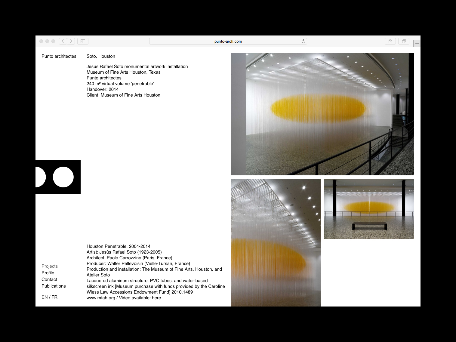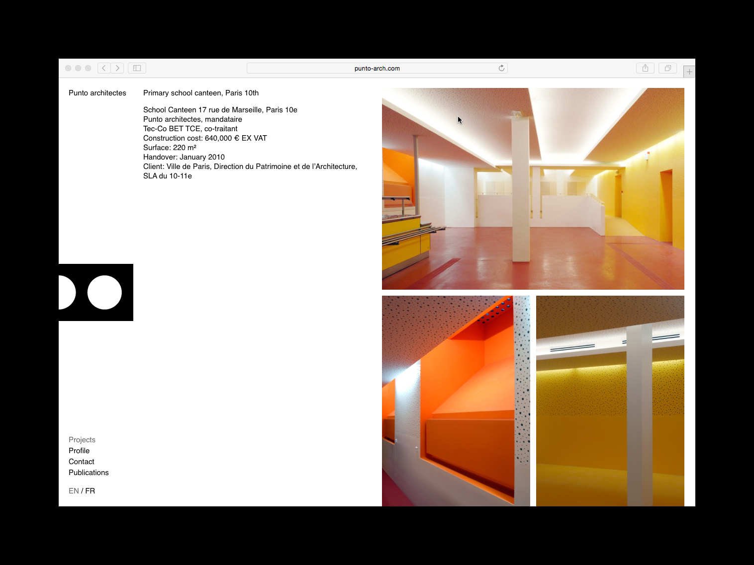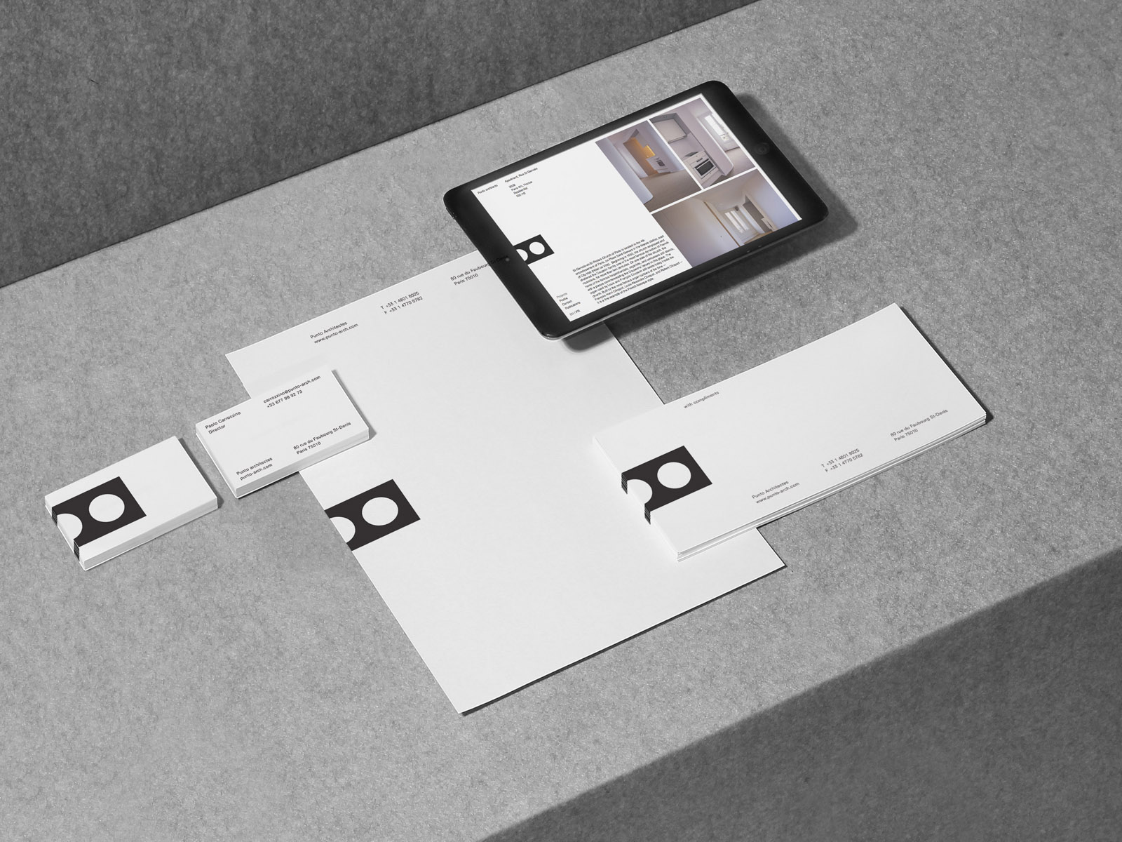 The logo is a simple mark with a white circle as central motif – 'punto' means both 'dot' and 'point' in both Italian and Spanish – while a highly abstracted P can also be seen on closer inspection. Throughout stationery, website and other collateral, the logo is always positioned on the centre of the horizontal axis. On the website, a vertical axis down the centre of the screen separates the text and image area, creating a layout that is balanced and dynamic at the same time.