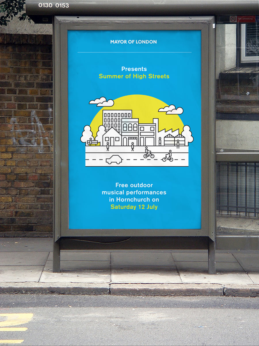 In order to illustrate and assemble complex urban scenes, a comprehensive set of icons were created. These images formed the identity of the campaign, and were used throughout the Mayor's Summer of High Streets communication and events.
