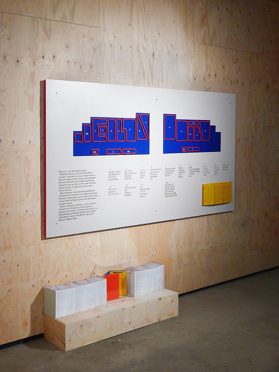 Central Saint Martins College of Arts and Design is considered one of the leading art institutions worldwide. It trains one of the largest Graphic Design courses of its kind in the UK, with around 150 students graduating from BA Graphic Design every year. Since moving to it’s purpose built King's Cross campus in 2012, our studio has been in charge of designing the exhibition design and the curation for the final year exhibition.