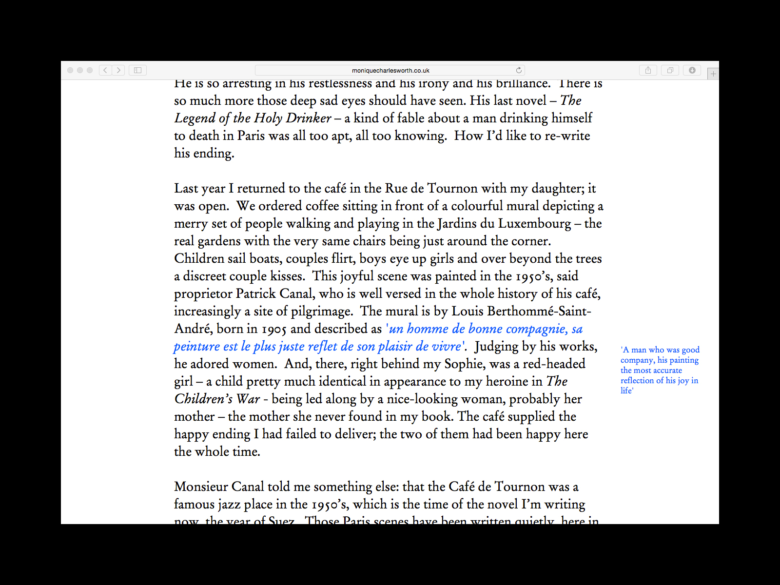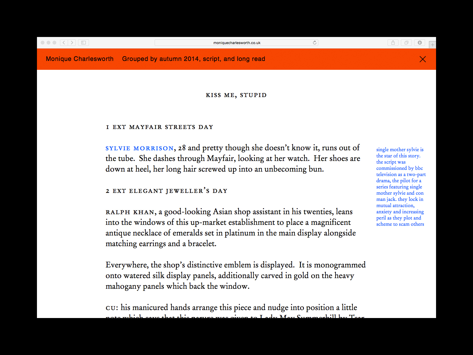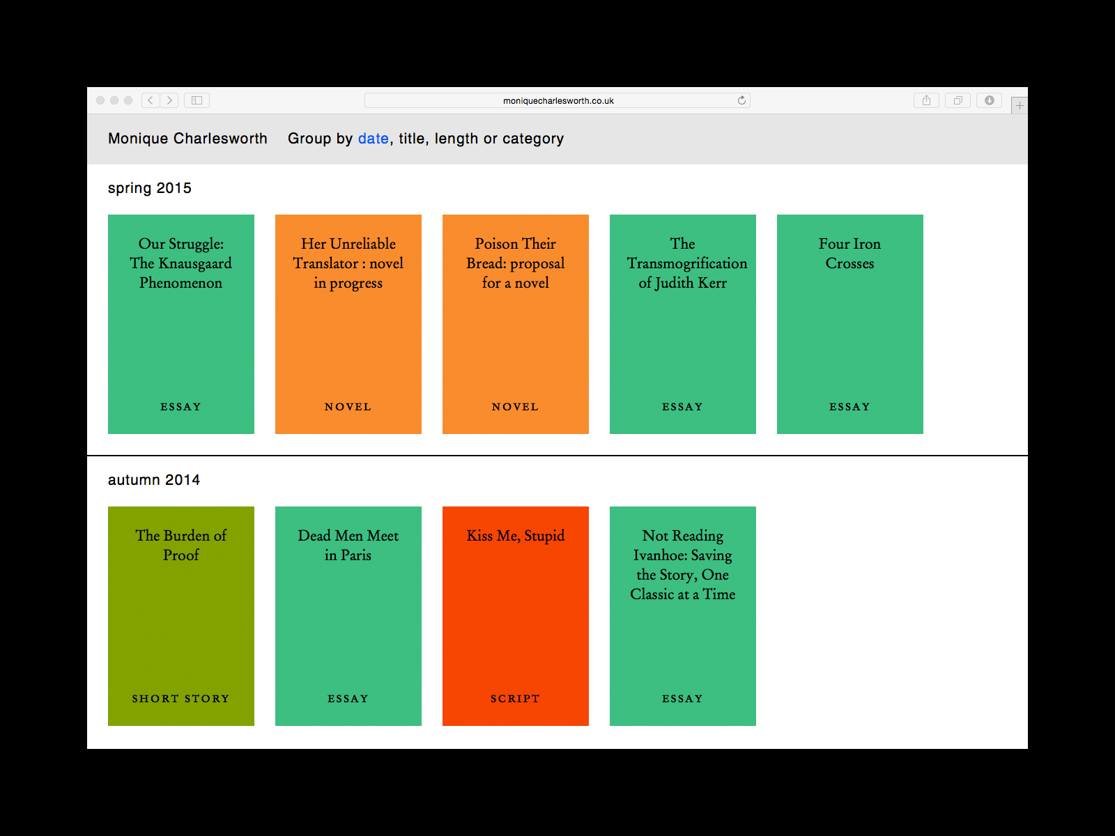 The online archive of writer, critic and journalist, Monique Charlesworth. Presented as a library of colour-coded books, these periodic entries can be ordered by a number of criteria to facilitate alternative modes of navigation. Our main objective was to bridge the gap between the printed and online page, whilst maintaining a clear and easy-to-use tool.