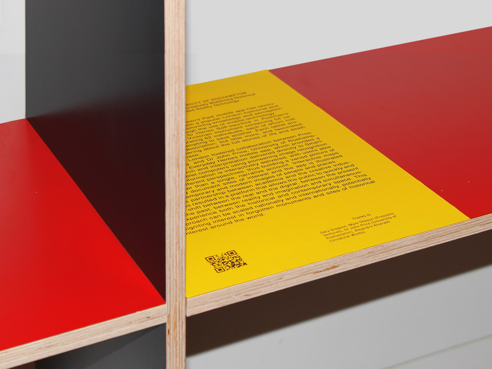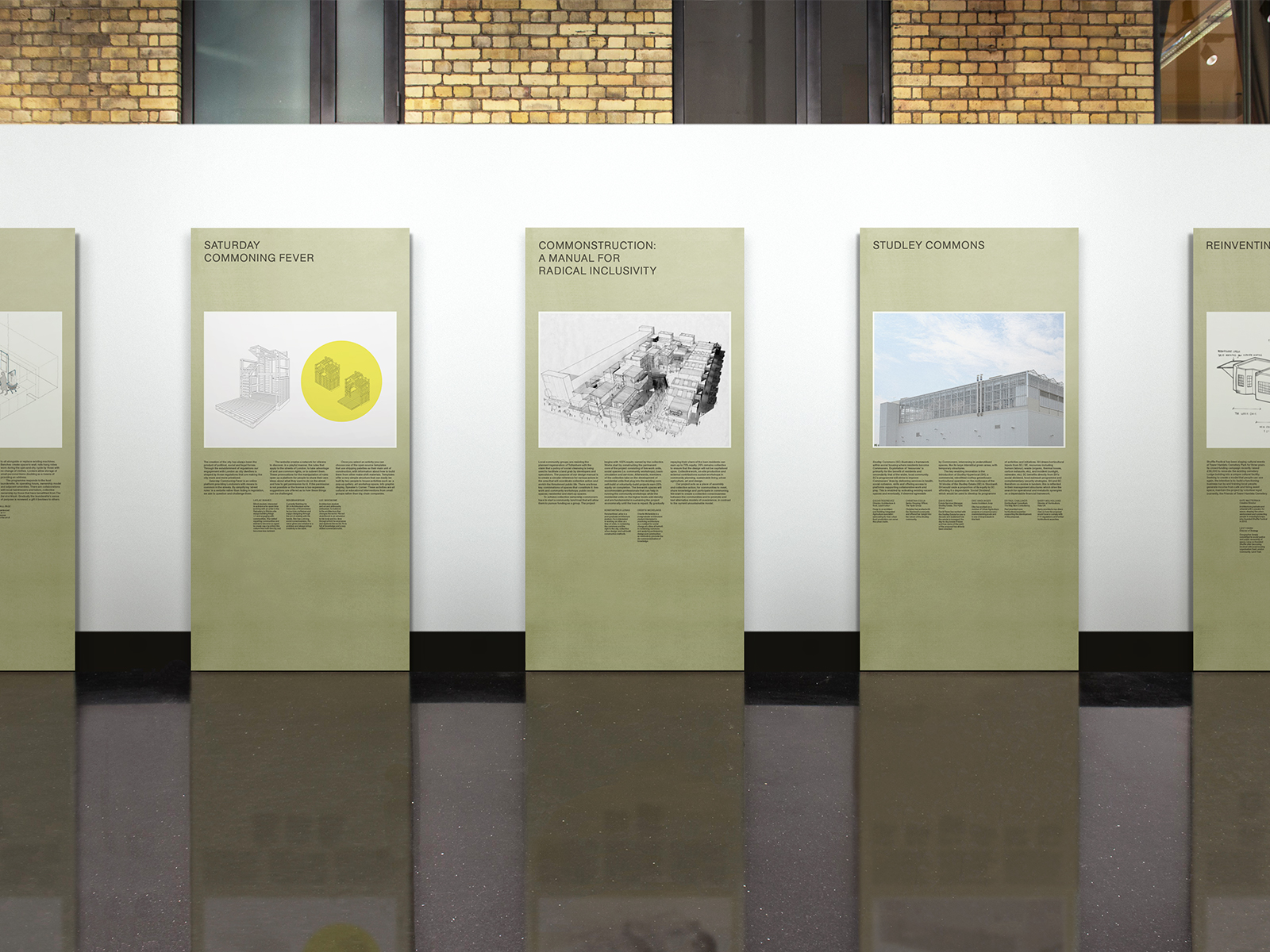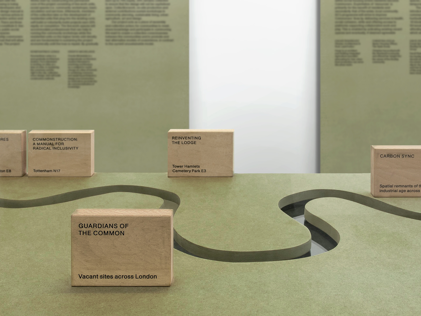 In response to the immediacy of the proposals, the free-standing exhibition displays were built according to a simple modular system, using a combination of off-the-shelf materials. Spanning the length of the room, each of the ten London competition winners were given a 2 × 4 board. A geographical map situating the proposals was contained within one of the two vitrines, allowing the New York entries to be displayed within the second.
